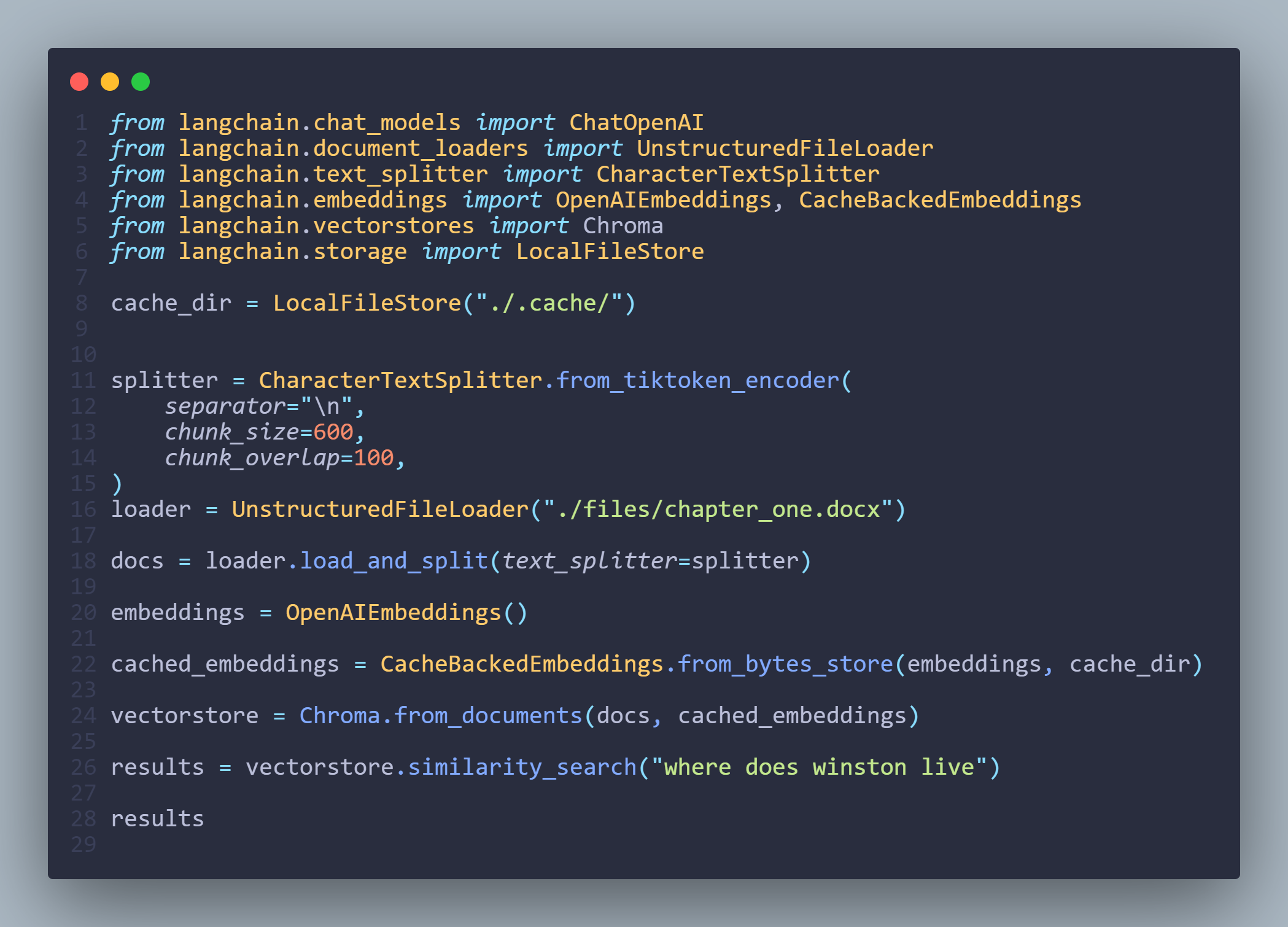 [Document(page_content="Winston turned round abruptly. He had set his features into the expression of quiet optimism which it was advisable to wear when facing the telescreen. He crossed the room into the tiny kitchen. By leaving the Ministry at this time of day he had sacrificed his lunch in the canteen, and he was aware that there was no food in the kitchen except a hunk of dark-coloured bread which had got to be saved for tomorrow's breakfast. He took down from the shelf a bottle of colourless liquid with a plain white label marked VICTORY GIN. It gave off a sickly, oily smell, as of Chinese ricespirit. Winston poured out nearly a teacupful, nerved himself for a shock, and gulped it down like a dose of medicine.", metadata={'source': './files/chapter_one.docx'}), Document(page_content="Winston turned round abruptly. He had set his features into the expression of quiet optimism which it was advisable to wear when facing the telescreen. He crossed the room into the tiny kitchen. By leaving the Ministry at this time of day he had sacrificed his lunch in the canteen, and he was aware that there was no food in the kitchen except a hunk of dark-coloured bread which had got to be saved for tomorrow's breakfast. He took down from the shelf a bottle of colourless liquid with a plain white label marked VICTORY GIN. It gave off a sickly, oily smell, as of Chinese ricespirit. Winston poured out nearly a teacupful, nerved himself for a shock, and gulped it down like a dose of medicine.", metadata={'source': './files/chapter_one.docx'}), Document(page_content='Winston kept his back turned to the telescreen. It was safer, though, as he well knew, even a back can be revealing. A kilometre away the Ministry of Truth, his place of work, towered vast and white above the grimy landscape. This, he thought with a sort of vague distaste -- this was London, chief city of Airstrip One, itself the third most populous of the provinces of Oceania. He tried to squeeze out some childhood memory that should tell him whether London had always been quite like this. Were there always these vistas of rotting nineteenth-century houses, their sides shored up with baulks of timber, their windows patched with cardboard and their roofs with corrugated iron, their crazy garden walls sagging in all directions? And the bombed sites where the plaster dust swirled in the air and the willow-herb straggled over the heaps of rubble; and the places where the bombs had cleared a larger patch and there had sprung up sordid colonies of wooden dwellings like chicken-houses? But it was no use, he could not remember: nothing remained of his childhood except a series of bright-lit tableaux occurring against no background and mostly unintelligible.', metadata={'source': './files/chapter_one.docx'}), Document(page_content='Winston kept his back turned to the telescreen. It was safer, though, as he well knew, even a back can be revealing. A kilometre away the Ministry of Truth, his place of work, towered vast and white above the grimy landscape. This, he thought with a sort of vague distaste -- this was London, chief city of Airstrip One, itself the third most populous of the provinces of Oceania. He tried to squeeze out some childhood memory that should tell him whether London had always been quite like this. Were there always these vistas of rotting nineteenth-century houses, their sides shored up with baulks of timber, their windows patched with cardboard and their roofs with corrugated iron, their crazy garden walls sagging in all directions? And the bombed sites where the plaster dust swirled in the air and the willow-herb straggled over the heaps of rubble; and the places where the bombs had cleared a larger patch and there had sprung up sordid colonies of wooden dwellings like chicken-houses? But it was no use, he could not remember: nothing remained of his childhood except a series of bright-lit tableaux occurring against no background and mostly unintelligible.', metadata={'source': './files/chapter_one.docx'})]