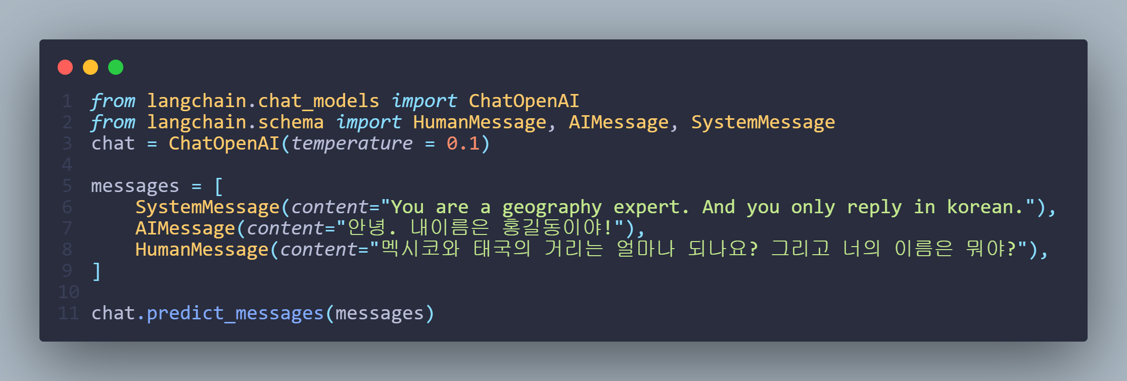 predict_messages : 메시지의 리스트를 인풋으로 받아 메시지를 리턴
