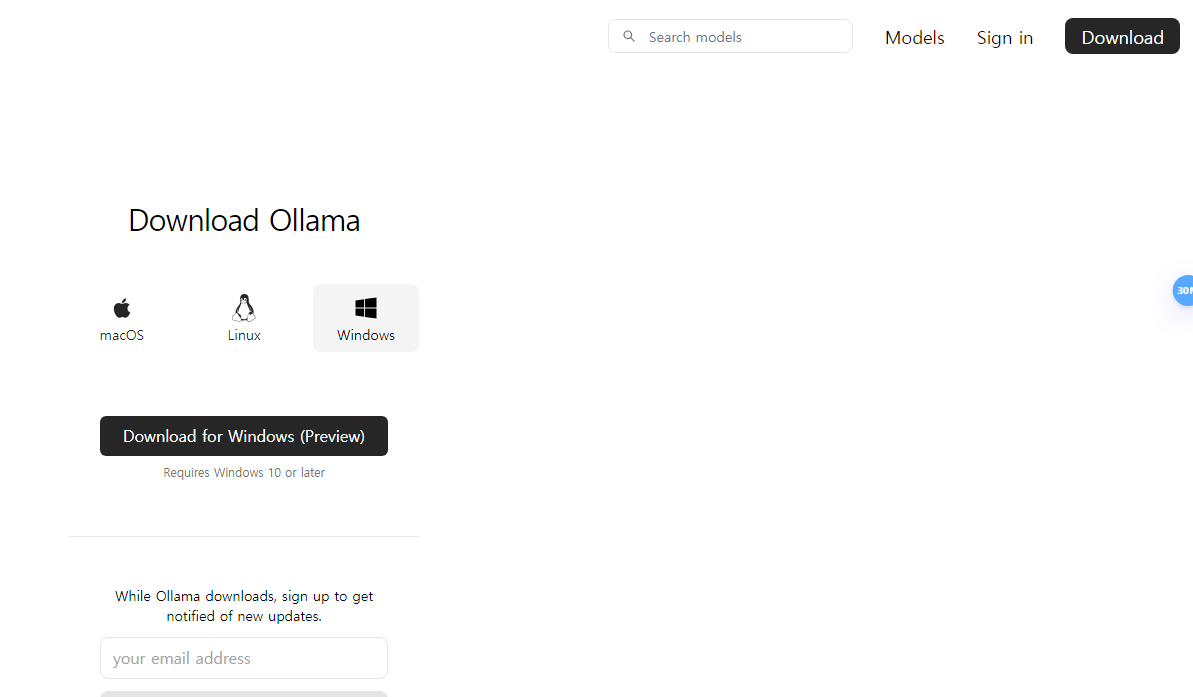 1. 다운로드 페이지에서 해당 os 에 맞는 ollama를 다운받아 설치